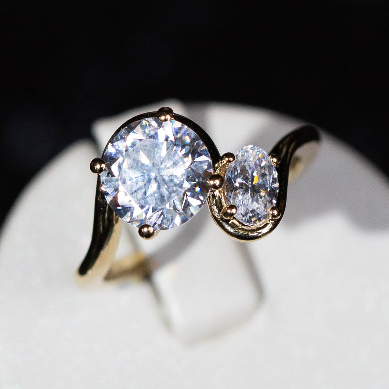 Arched shoulders lift the center stone slightly, creating an open and elevated feel