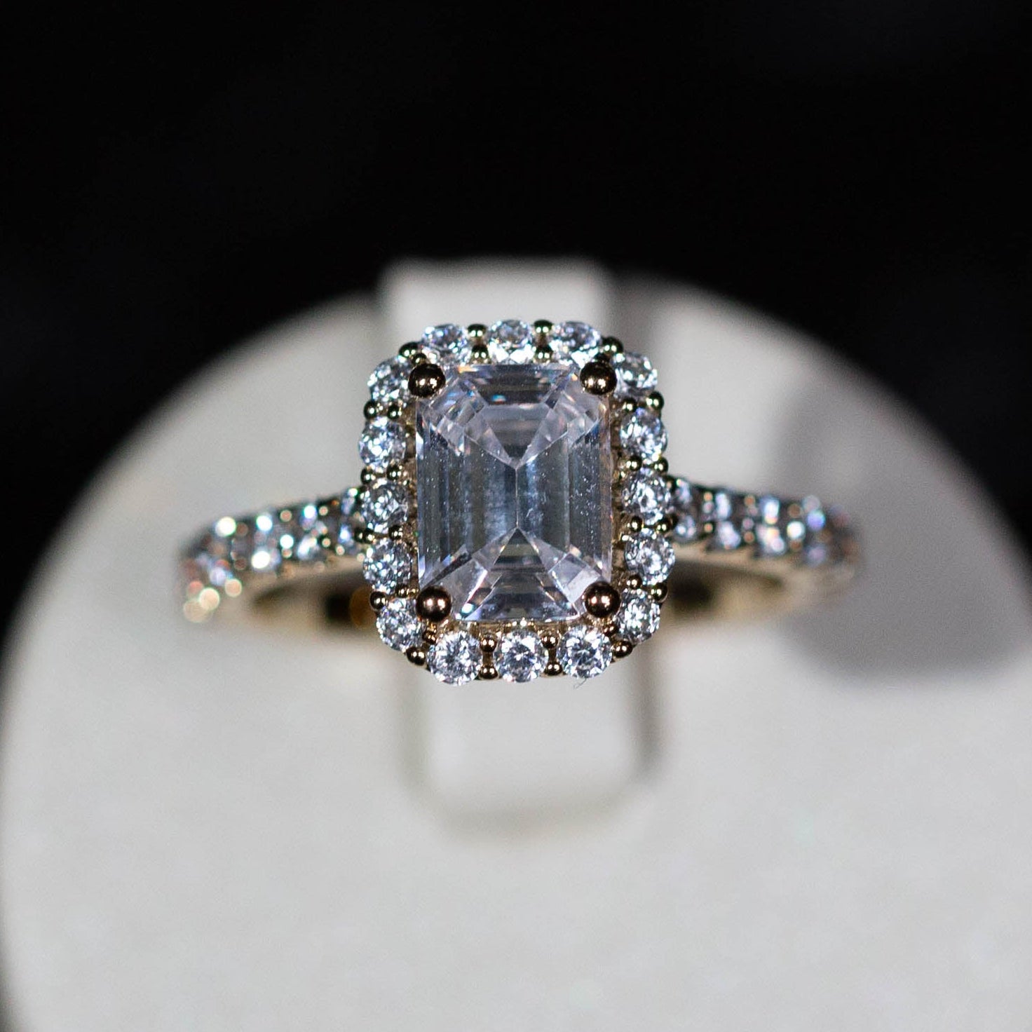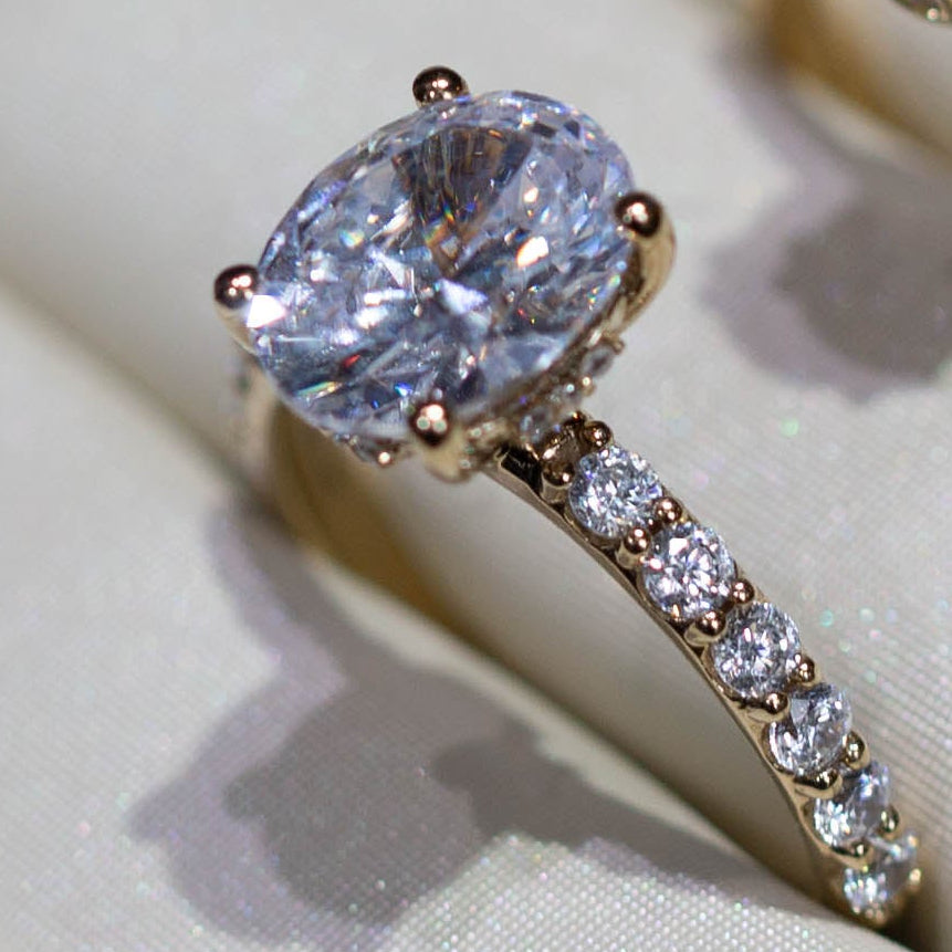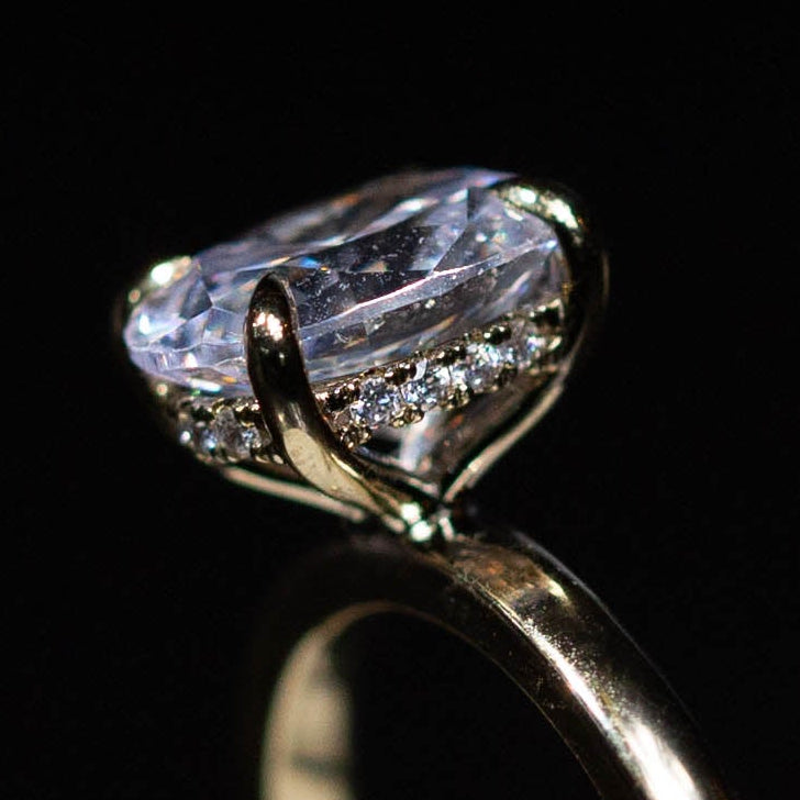 A subtle circle of diamonds beneath the center stone that adds sparkle from the side