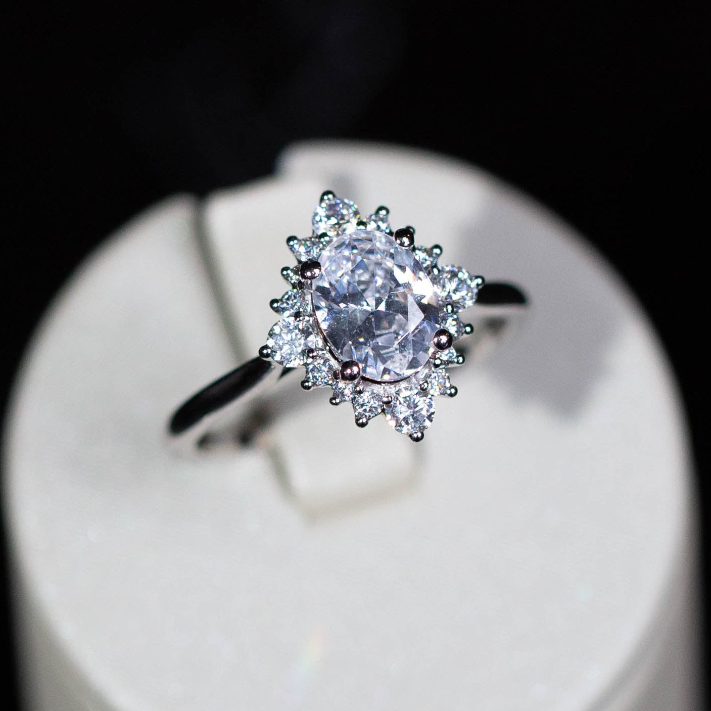 A circle of smaller diamonds surrounds the center stone, adding sparkle and creating the look of a larger center