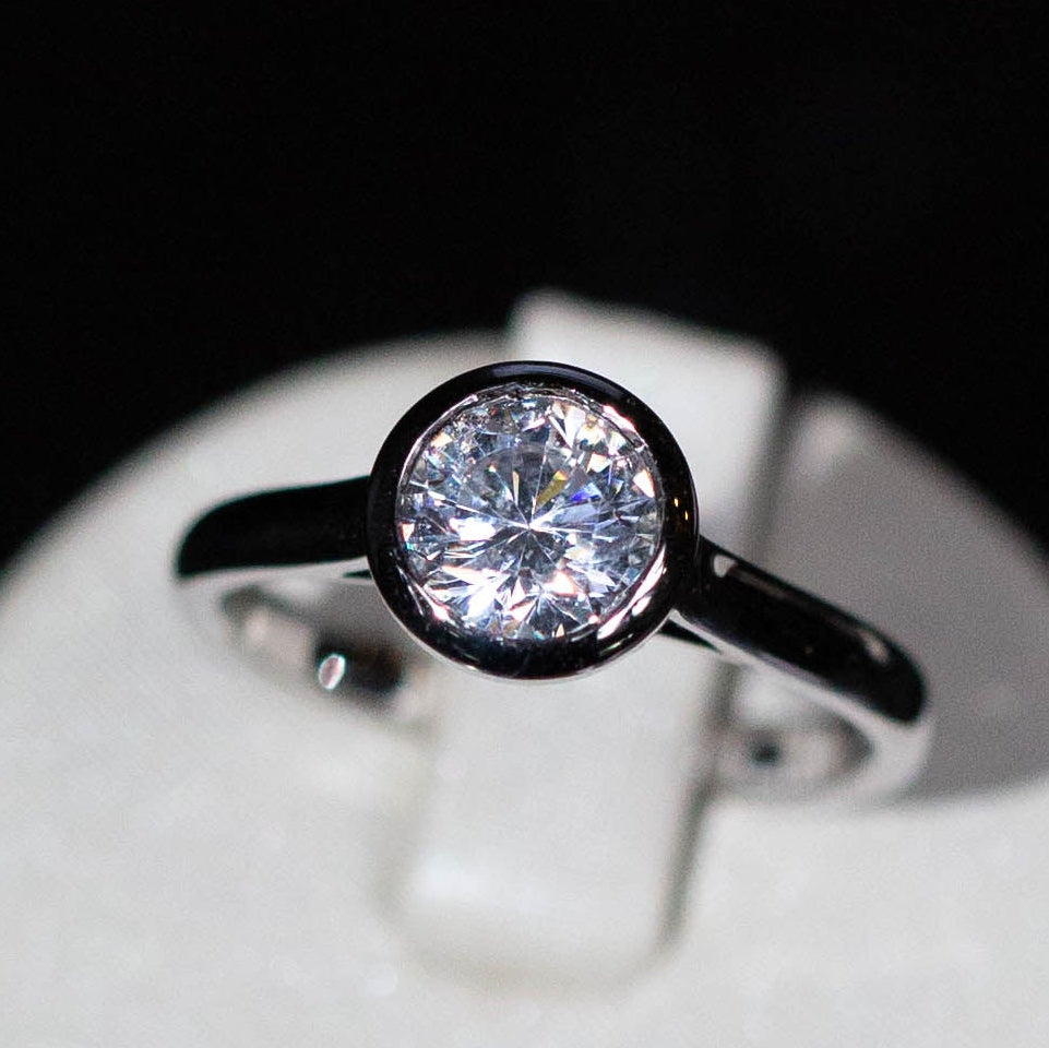 A clean rim of metal surrounds the diamond for a modern look and added protection