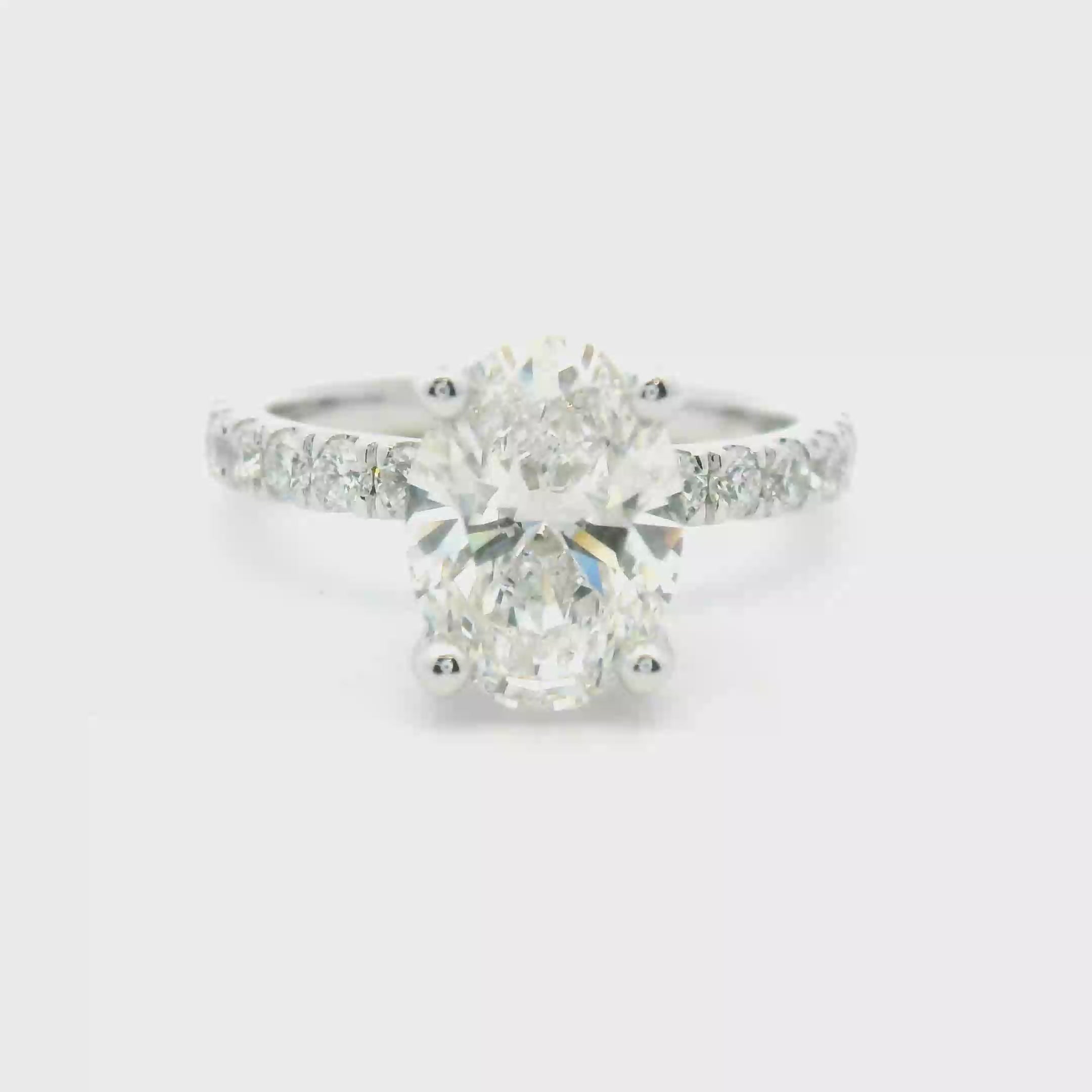 A timeless engagement ring featuring an oval center diamond set on a band lined with small accent diamonds and a hidden halo tucked just beneath the center stone. The clean, elegant design keeps the focus on the center diamond while the hidden halo adds a subtle touch of extra sparkle from the side. It’s a classic style that pairs beautifully with many wedding bands and works well for everyday wear. Since every engagement ring we create is designed around the person wearing it, this design can always be customized with different diamond sizes, shapes, or metal colors.