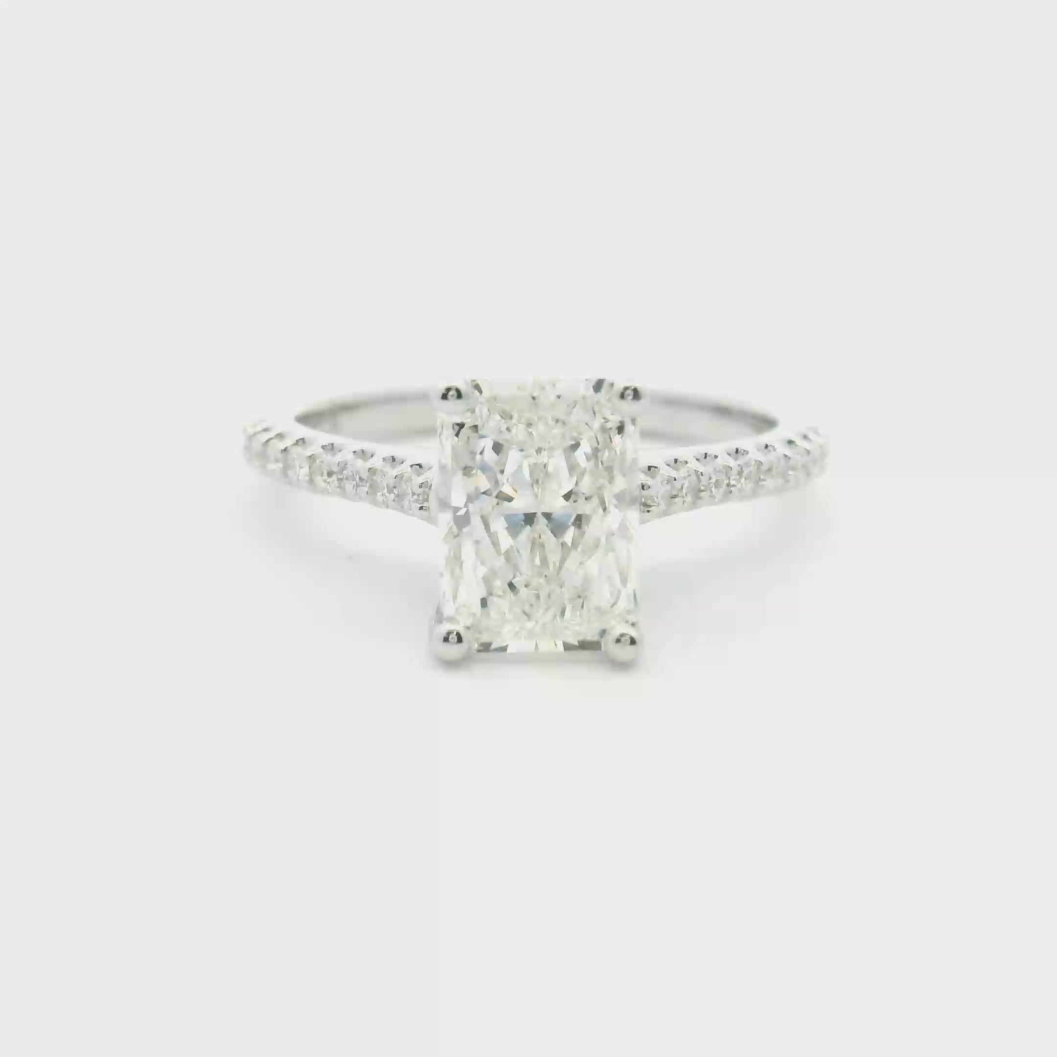 A beautiful engagement ring featuring a radiant cut center diamond set on a band lined with small accent diamonds. The clean lines of the radiant cut combined with the added sparkle along the band create a balanced look that feels both modern and timeless. It’s a versatile style that pairs easily with many wedding bands and works well for everyday wear. Since every engagement ring we create is designed around the person wearing it, this design can always be customized with different diamond sizes, shapes, or metal colors.