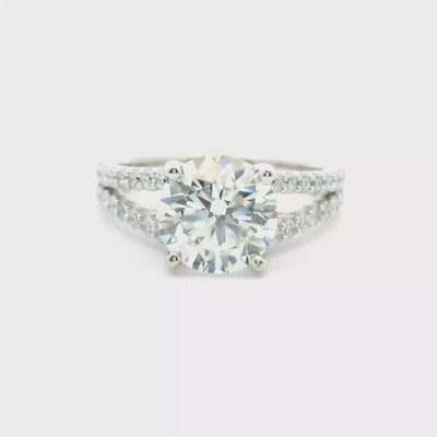 A beautiful engagement ring featuring a round center diamond set between a sparkling split shank band lined with accent diamonds. The open split design naturally draws your eye to the center stone while adding extra shimmer from every angle. It’s a balanced look that pairs easily with many wedding bands and works well for everyday wear. Since every engagement ring we create is designed around the person wearing it, this design can always be customized with different diamond sizes, shapes, or metal colors.