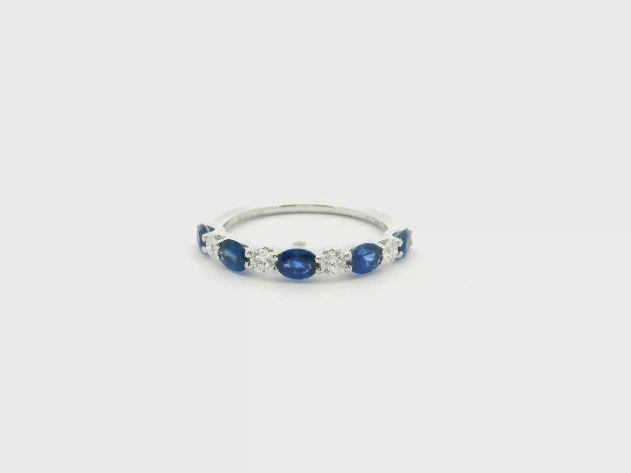 A delicate stackable band featuring alternating oval blue sapphires and round diamonds set across the top of the ring. The rich blue sapphires provide vibrant color while the round diamonds add bright contrast and sparkle, creating a balanced alternating pattern. This style works beautifully stacked with other bands or worn on its own as a refined accent ring and can be customized with different gemstones, diamond sizes, band widths, or metal options.