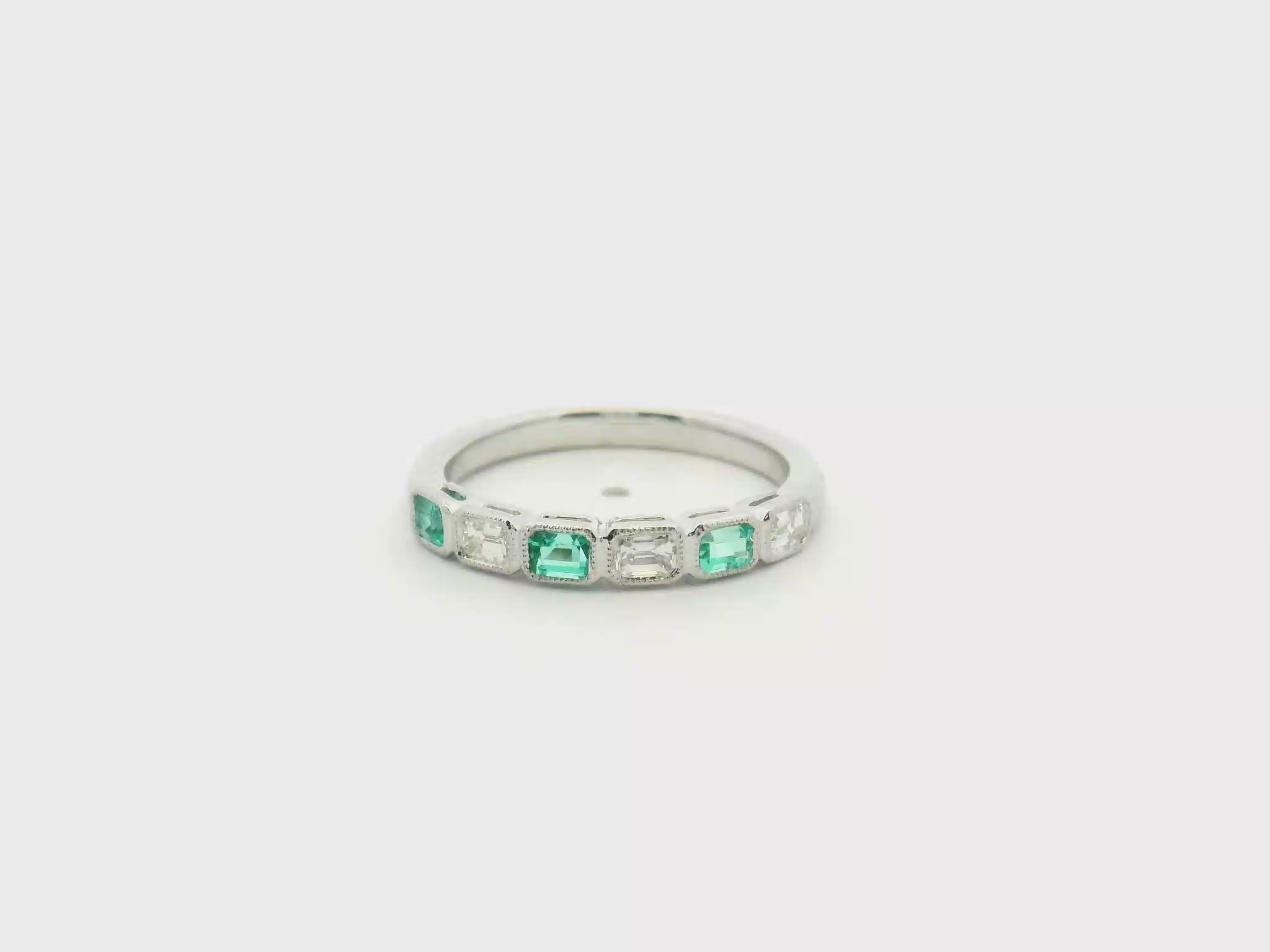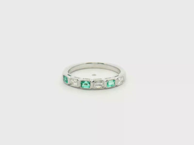 A bezel set emerald and diamond stackable band featuring alternating emerald cut green emeralds totaling approximately 0.28 carats and emerald cut diamonds totaling approximately 0.31 carats. Each stone is individually framed with subtle milgrain detailing, adding texture and definition to the clean bezel settings. The alternating emerald and diamond pattern creates a balanced look with rich green color and bright contrast. Bands like this can be stacked or worn alone and can always be customized with different gemstones, stone sizes, band widths, or metal options.