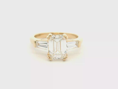This yellow gold engagement ring features an emerald cut center diamond accented by tapered baguette side stones in a classic three stone layout with prong settings. The design has a clean, structured look with crisp step-cut flashes and balanced proportions that create strong finger coverage while maintaining a refined profile. It wears beautifully as a timeless engagement style and pairs easily with both simple bands or diamond wedding rings. This design can be recreated with different diamond shapes, sizes, or gold colors to suit your preference.