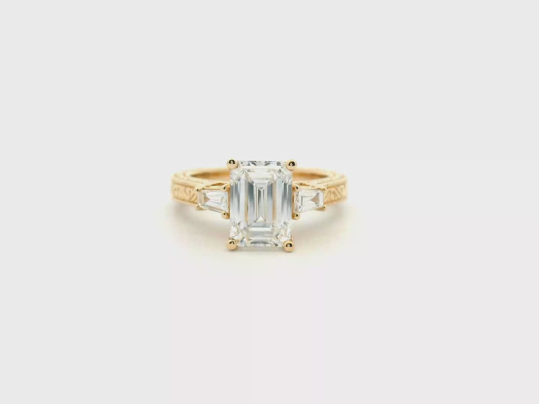 Yellow gold engagement ring featuring an emerald-cut diamond center with tapered baguette side stones in a four-prong three-stone setting. The design has a structured, balanced look with clean step-cut sparkle and refined milgrain and engraved scroll detail along the shank, creating a noticeable yet comfortable profile. Easy to wear daily and pairs naturally with straight or contoured bands. This style can be recreated with different diamond shapes, side stone proportions, or gold colors.