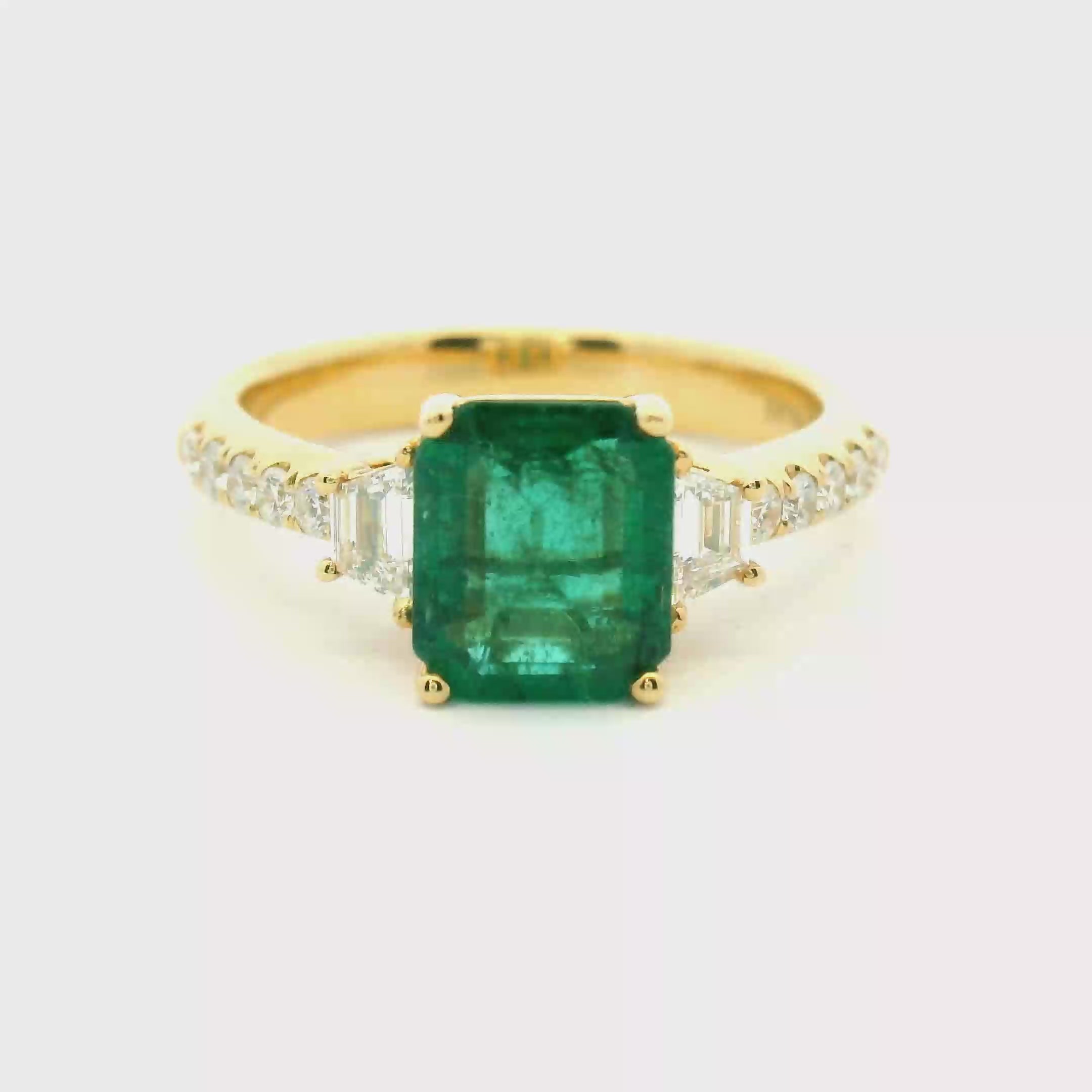 A striking three stone ring featuring a vibrant emerald-cut emerald at the center, accented by tapered baguette diamonds on each side with additional round diamond accents along the band. The rich green emerald creates a beautiful focal point while the diamonds add soft shimmer and balance to the design. This style works beautifully as a unique engagement ring or a colorful statement piece for everyday elegance or special occasions. If you love the look but are imagining something a little different, this design can always be recreated with different center stones, diamond shapes, or metal colors.