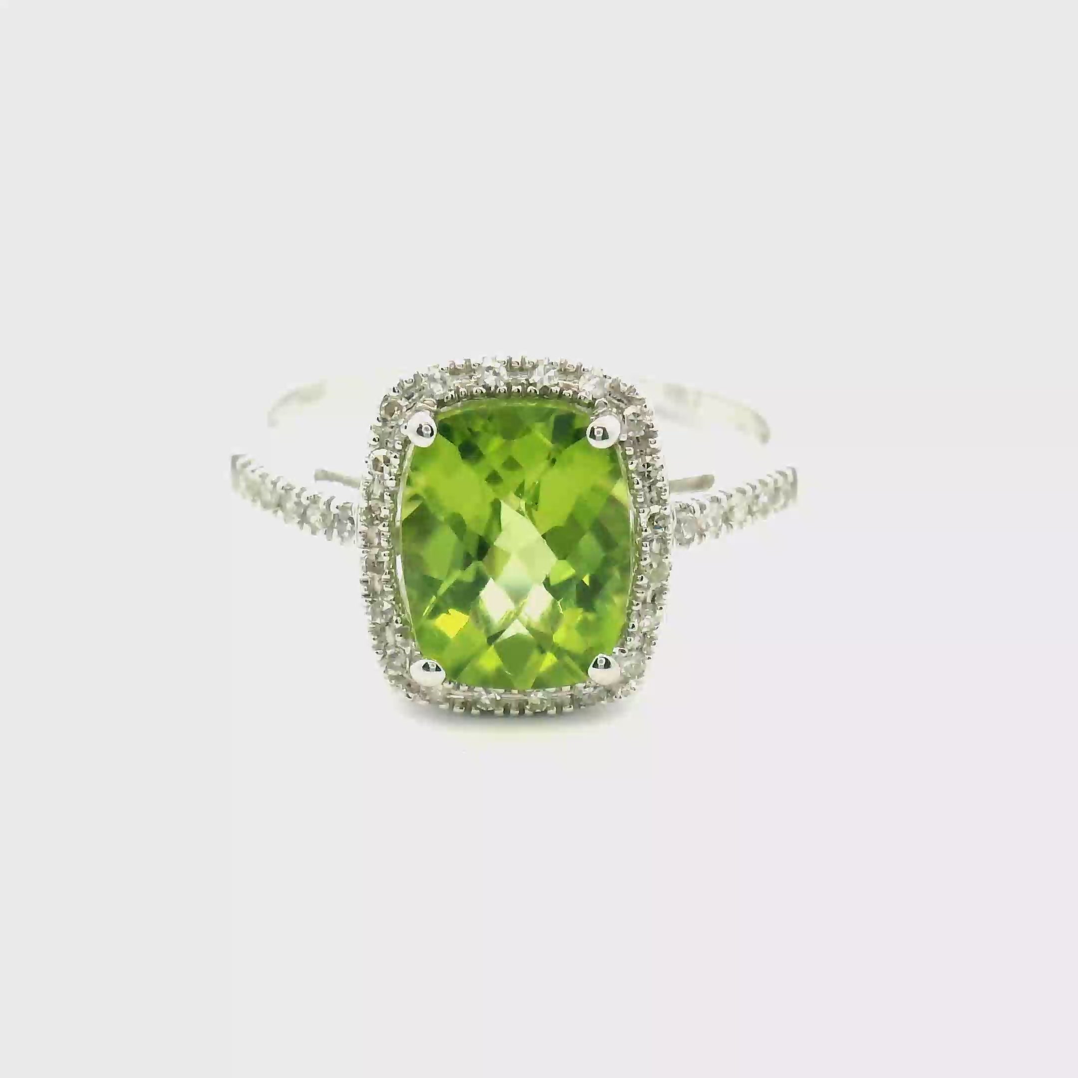 A vibrant ring featuring a cushion-shaped peridot surrounded by a halo of round diamonds with additional diamond accents along the band totaling approximately 0.12 carats. The bright green gemstone is beautifully framed by the delicate halo, while the diamond-accented shank adds extra sparkle and balance to the design. Rings like this make a striking statement, whether worn as a cocktail ring, a bold right-hand ring, or a colorful piece for special occasions. If you’re imagining it a little differently, it can always be recreated with a different center gemstone, halo style, or metal color.