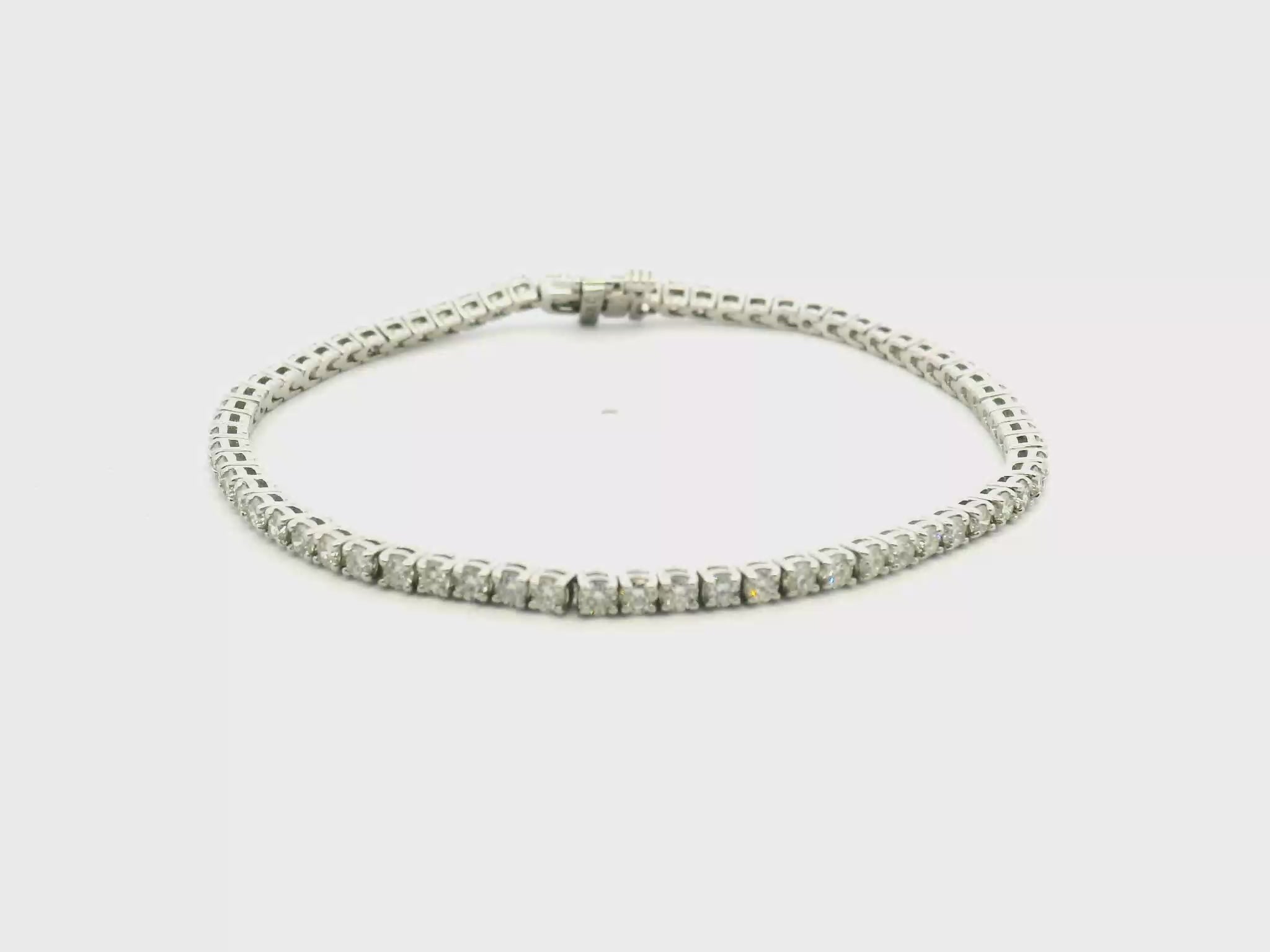 This white gold tennis bracelet features round diamonds totaling 3 carats set in a refined straight-line design with classic prong settings. The minimal metal presence allows for bright, continuous sparkle across the wrist while maintaining a clean, fluid profile that wears comfortably from day to night. It layers effortlessly with other bracelets or stands on its own for a timeless diamond look suited to both casual and elevated styling. This style can be recreated with different diamond sizes, gemstones, or gold colors to suit your preference.
